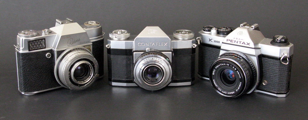 Zeiss Ikon pioneered the design of the leaf-shutter single lens reflex camera with the first Contaflex which came to the market in 1953. The company brought some radically new thinking in camera construction to the task which seems likely to have been inspired by the work of Hubert Nerwin. Although Nerwin was long gone to America by 1953, there are many aspects of the Contaflex design which echo his innovative thinking as it was manifested in the Contax II, the Contessa 35, and espcially in the little Ikonta 35. As shown in the comparison below, the Contaflex was significantly smaller than the contemporary Kodak Retina Reflex or the much later focal plane shutter models like the Pentax K1000.