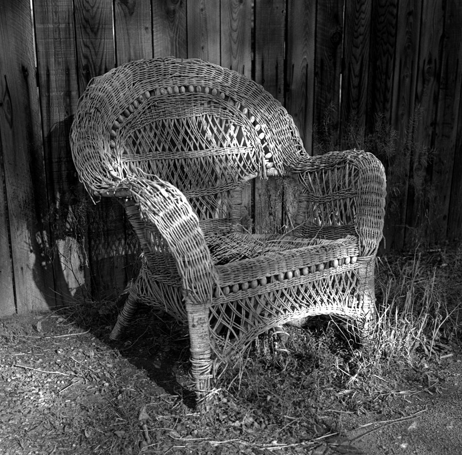 This wicker chair has been sitting for months beside the road a half block from my house; I pass by it daily when I'm walking the dog. I have made pictures of the chair with several cameras. This is the one I have liked most so far; it was shot on Kentmere 400 in my Yashica-Mat.